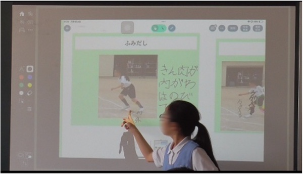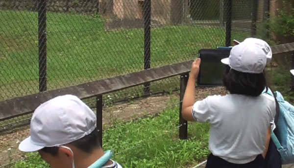 広島県の安佐動物公園にてフィールドワークを行い、馬や鹿の足の動き方を観察して「つま先立ちで走っている」と気づきました。学校に帰ってからは、撮影した動画を基に骨や筋肉のつくりについてタブレットを用いながら分析し考えをまとめて発表しました。