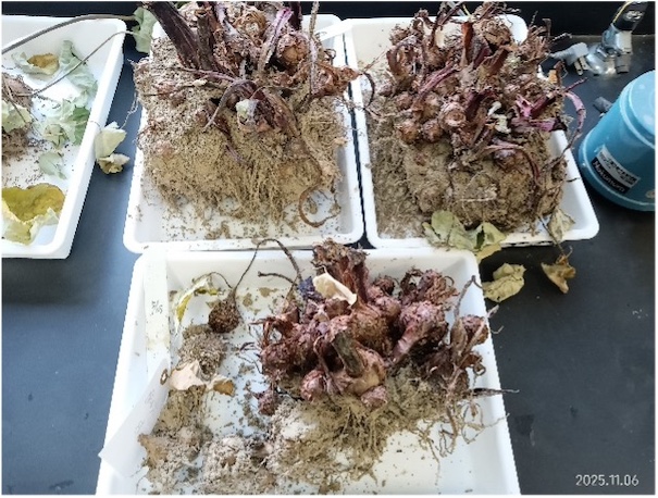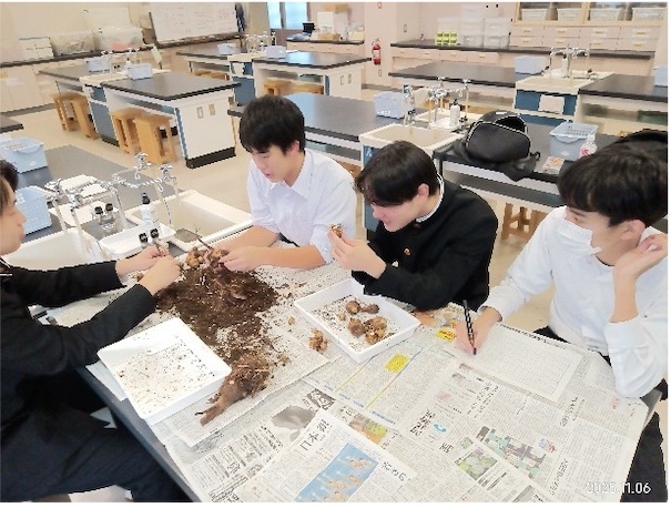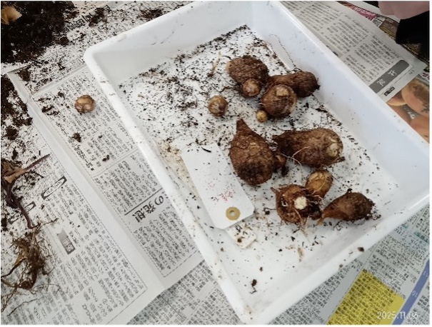 11月6日(木)にすでに収穫していた「上伊場野里芋」の収穫量調査を行いました。一株ごとに里芋の個体数と大きさ、総重量の測定を行いました。土壌を変えたことにより収穫量や個体数の大きさなどが大きく変わることが分かりました。これらの結果をデータ化して、成長の記録や土壌の成分との相関性を考察してみたいと思います。また、この上伊場野里芋を電子顕微鏡で観察し、どのような違いがあるのかを検証してみたいと思います。