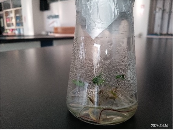 4月16日(木)、培養していた上伊場野里芋のウイルスフリー苗の順化を行いました。インビトロ苗をポットに移植して生育させ、現地の生産農家の圃場に定植することで、作成したウイルスフリー苗の有用性を検証していきます。
