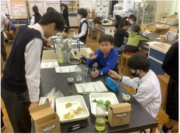科学実験教室の内容は、酸化還元反応による信号反応、緑葉と黄葉の薄層クロマトグラフィーによる色素分離等でした。児童は不思議な現象にワクワクし、感動の声をあげていました。