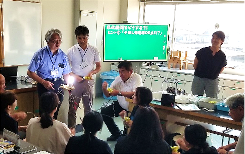 今回のテーマは、6年生の単元「電気の利用」です。作成した木炭電池によって器具による使用電気の量に違いあることを確かめる実験、手回し発電機で白熱球や蛍光灯を点灯させる実験、コンデンサーに貯める電気量を変えることでモーターカーの停止位置を制御する実験等を紹介し、最後に、これらの実験を活用したオリジナルな単元構成案を検討しました。