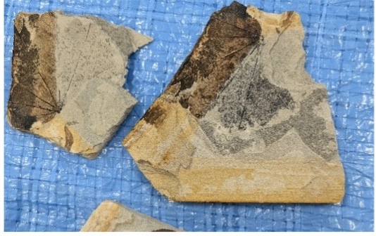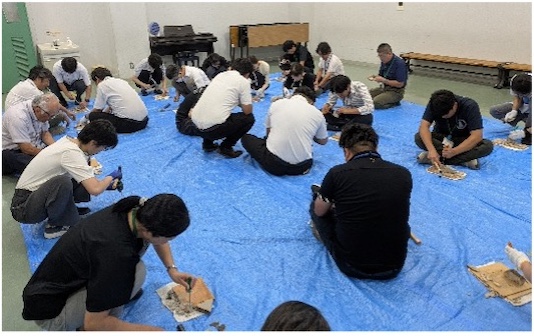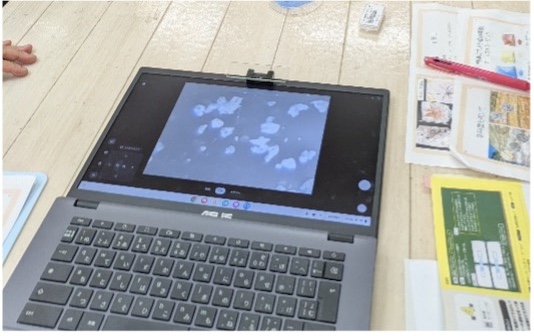 最近市販されたカラーサンドを用いての堆積地層モデルをつくる実験や、タブレットのレンズ部分に取り付けるタブレット顕微鏡を使っての火山灰の観察などを紹介し、最後に実際に岩石を割って化石を発掘する体験をしました。掘り出した化石は持ち帰り、授業に活用してもらうこととしました。