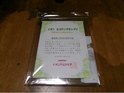 - 【愛知県立佐屋高等学校】第14回イオンエコワングランプリ最終審査会出場、選出証明書受領