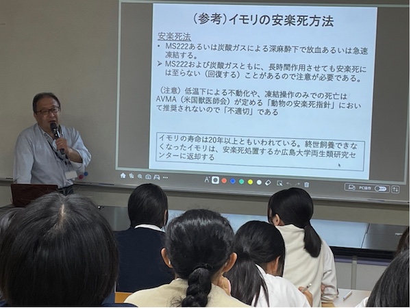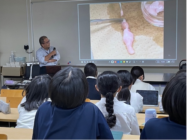 講習会には生徒30名が参加し、実験動物の定義や倫理の基本理念を学び、「生物を単なる材料として扱わない」という姿勢を確認しました。